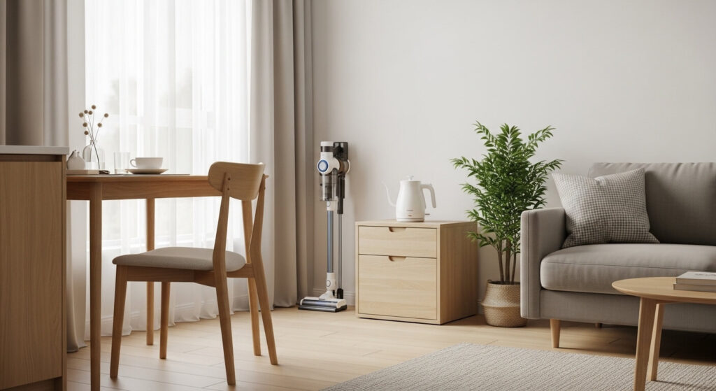 • メリット: 必要な時にサッと使えるため、掃除のハードルが下がります。 さらに、スタンド自立型なので、壁に穴を開ける必要がない点も賃貸には嬉しいポイントです。